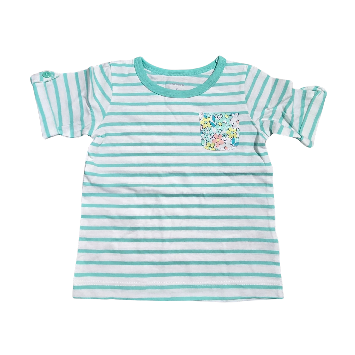 NWT | Carter's Baby Girl Striped Nautical Tee | Artistic Floral Pocket Motif | Mint & White | Size 6 Months