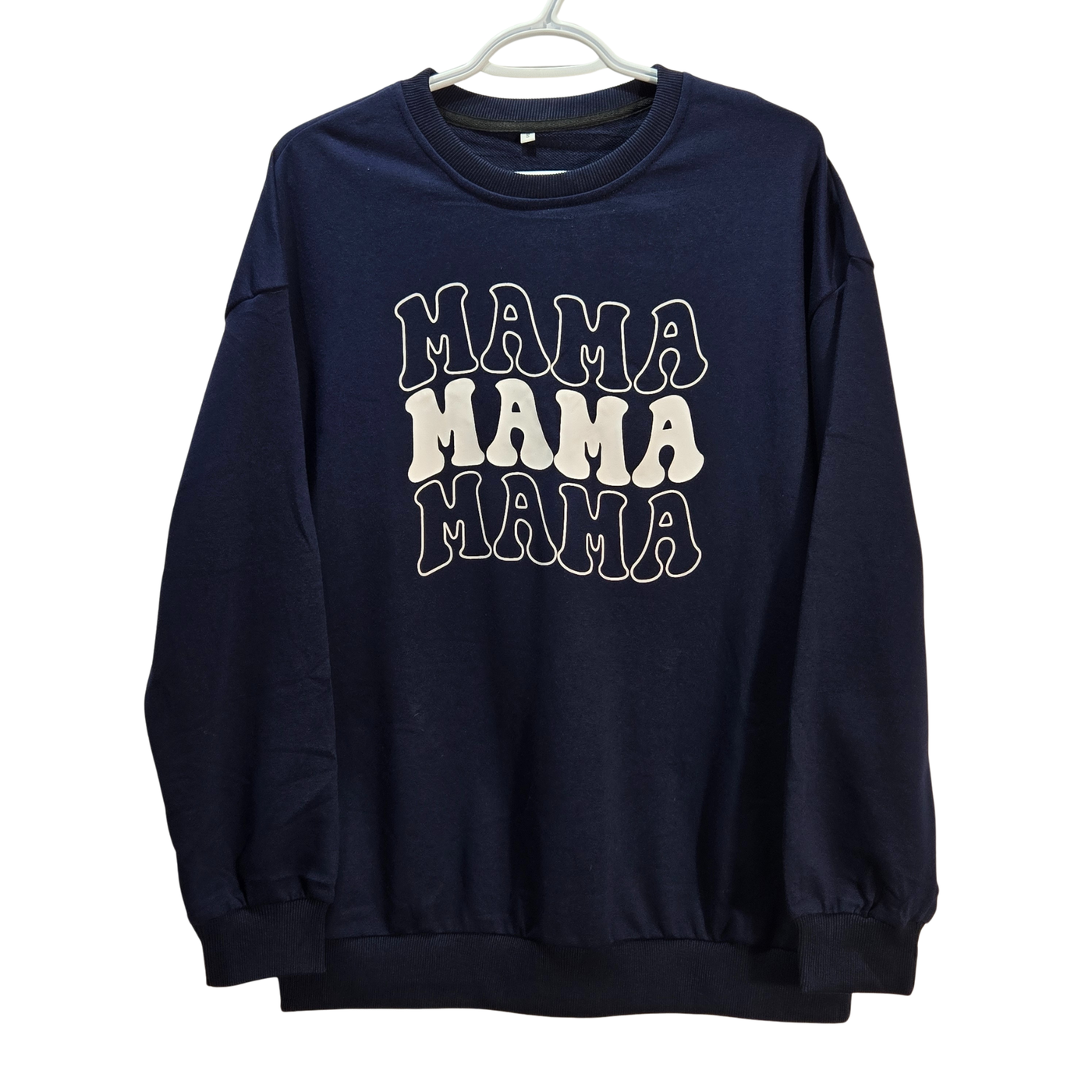 This cozy navy blue crewneck sweatshirt features a bold, stacked "Mama" graphic in a fun, retro font. It's the perfect oversized, comfy piece for running errands, lounging at home, or showing off your mom pride!