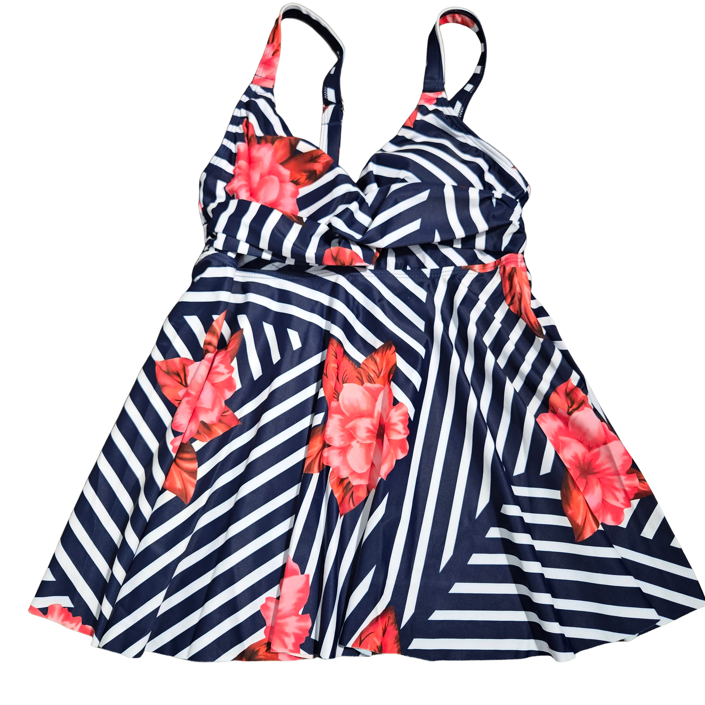 NWOT | Women's Skirted Two-Piece Tankini Swimsuit Set | Artistic Striped Floral Silhouette | Navy & White | Small