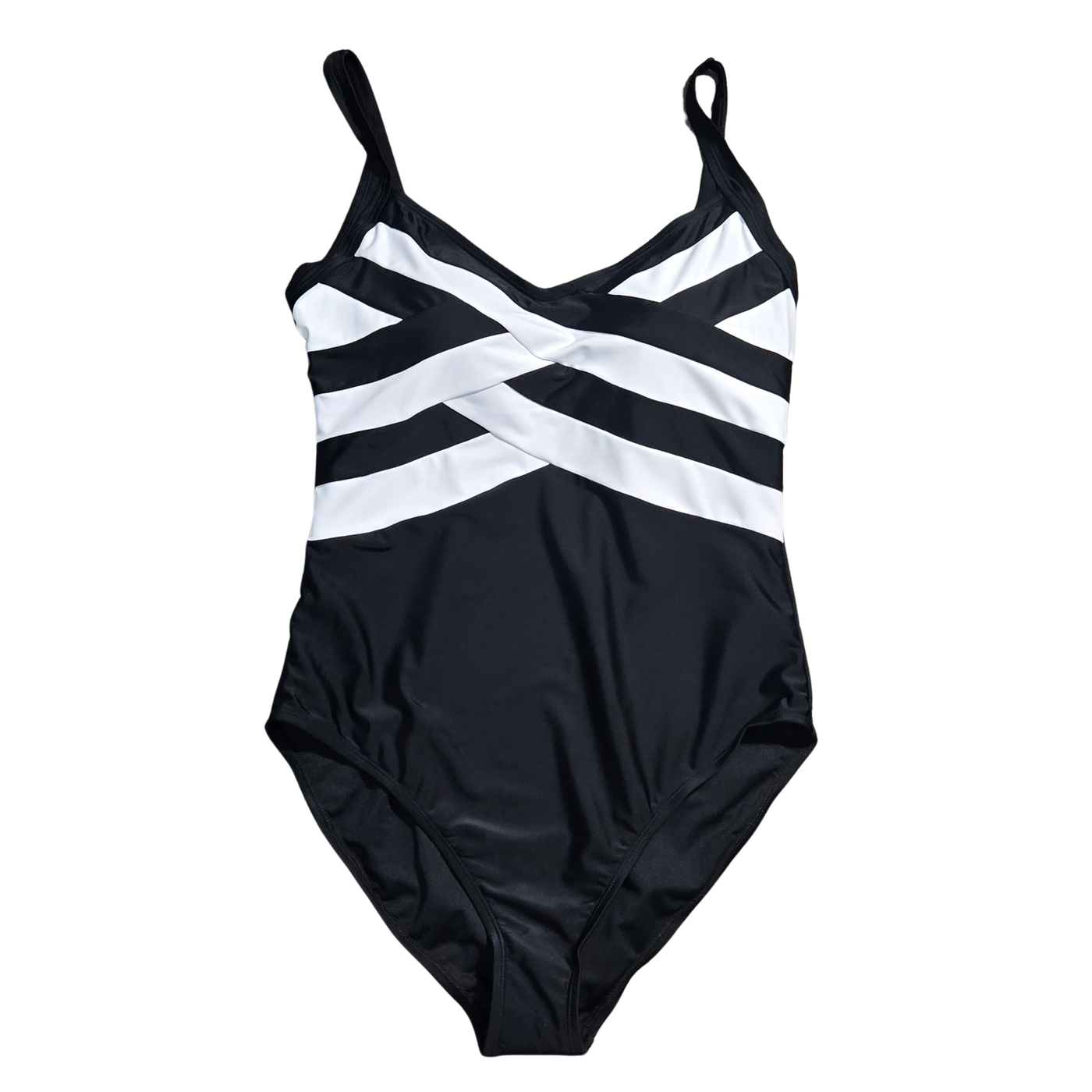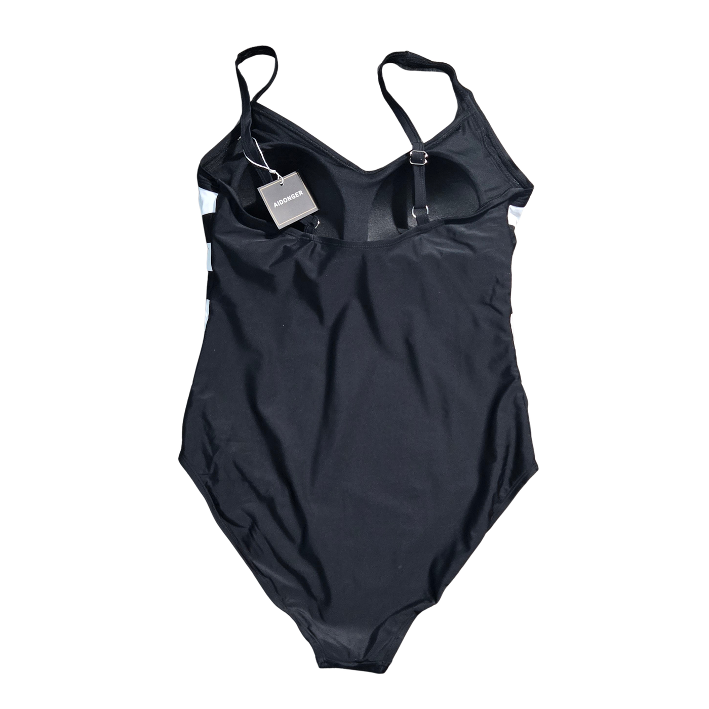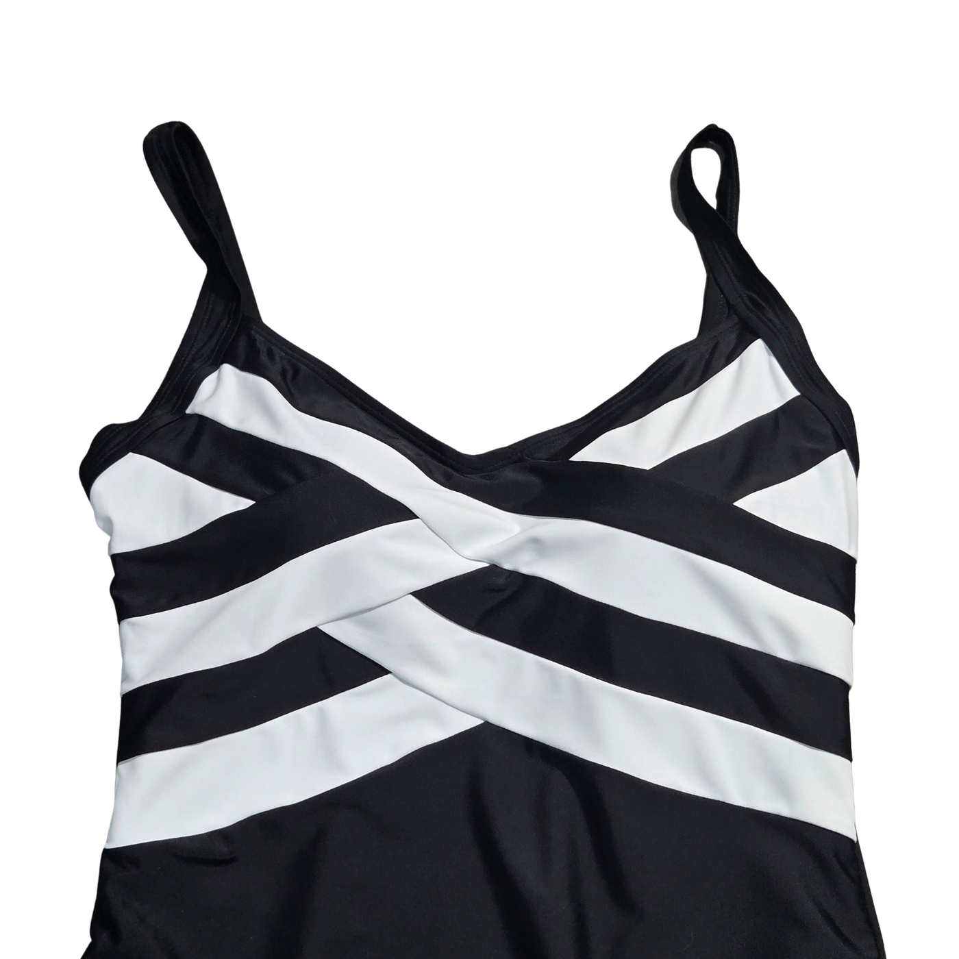 NWT | Aidonger Women's Black & White Striped Cross-Over One-Piece Swimsuit | Artistic Monochromatic Silhouette | Large