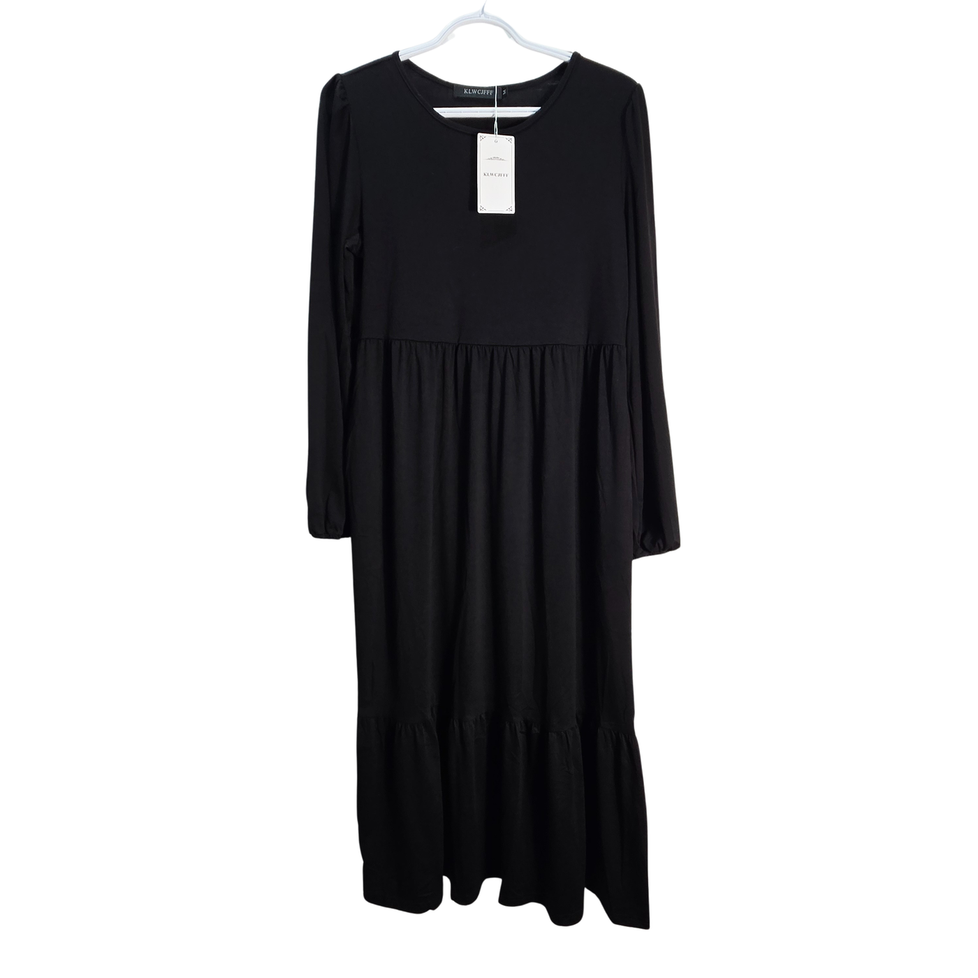 Embrace effortless style with this essential black long sleeve dress from KLWCJFFF. This elevated basic features a classic babydoll silhouette with a flattering high-waisted seam and a voluminous tiered skirt that drapes beautifully to a midi length. Designed for ultimate comfort and seasonal layering, it boasts a clean rounded neckline and streamlined long sleeves with subtle puff shoulder detailing for a touch of feminine volume. Crafted from a soft, high-stretch performance knit, this breathable dress ensures all-day comfort whether you're heading to the office or a casual dinner. Medium.