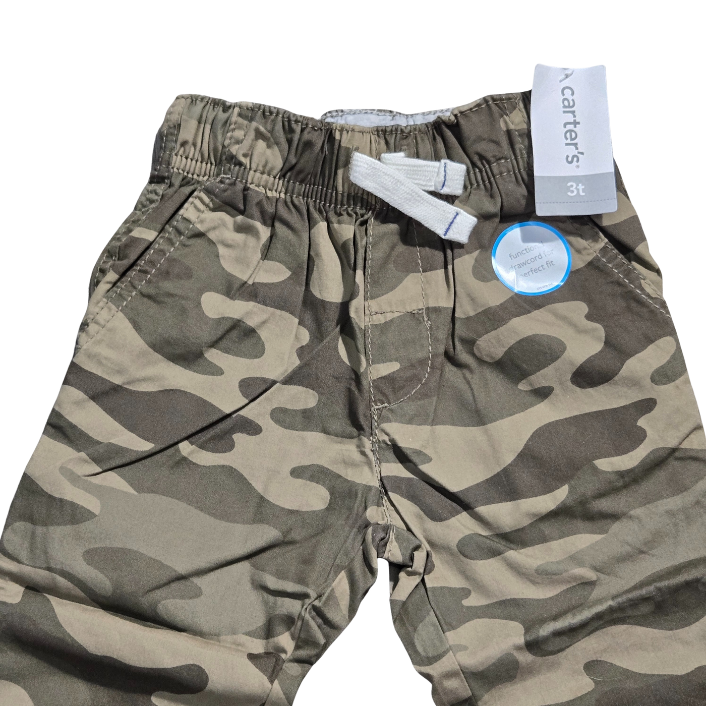Equip your little adventurer for all-day play with these classic camouflage print pants from Carter's. These versatile trousers feature a traditional woodland camo pattern in shades of olive, tan, and brown, perfect for outdoor exploration or casual daily wear. Designed for maximum comfort and independence, they boast a soft ribbed elastic waistband with a functional white drawstring to ensure a perfect, stay-put fit. Practical details include two front slash pockets for small treasures and reinforced stitching for added durability during playtime. Crafted from a breathable cotton-blend twill, these pants offer a comfortable straight-leg silhouette that pairs easily with his favorite tees and hoodies. 3T.