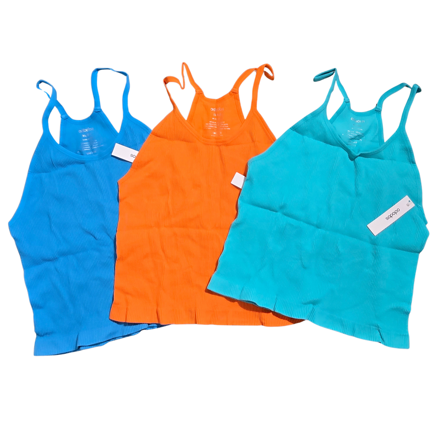 Grab this brand new 3-pack of comfortable, seamless ribbed tank tops, perfect for athletic activities, layering, or casual summer wear. This bundle includes three vibrant colors: a bright Blue, a bold Orange, and a bright Teal/Turquoise.
