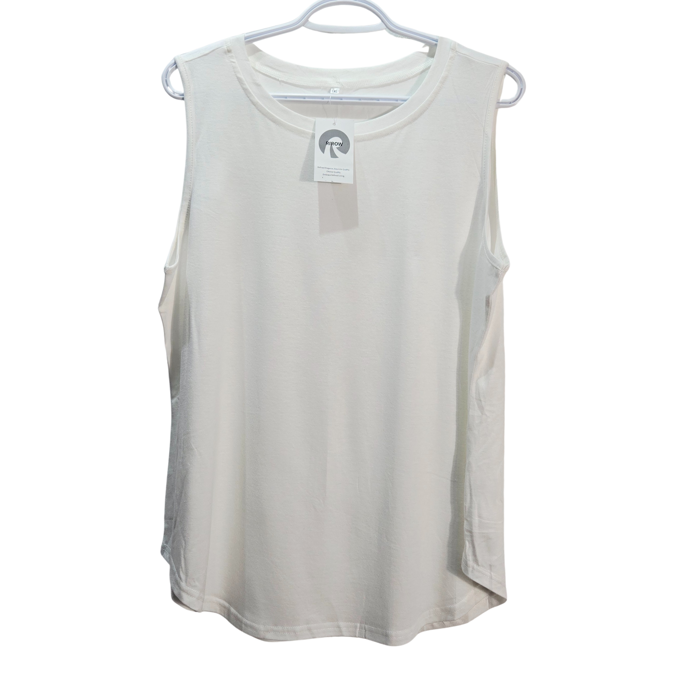 Elevate your daily rotation with this essential white tank top from RIROW. Rendered in a clean, timeless crisp white, this modern essential features a classic scoop neckline designed to frame the collarbone with understated elegance. The minimalist silhouette is engineered for a relaxed, flowy fit that pairs perfectly with high-rise denim, tailored trousers, or layered under your favorite blazer for a professional look. The design is finished with a flattering curved hemline, adding a soft, feminine touch to the athletic-inspired cut. Crafted from a high-quality soft-touch performance knit, this top provides exceptional breathability and comfortable stretch for all-day wear. Size 1XL.