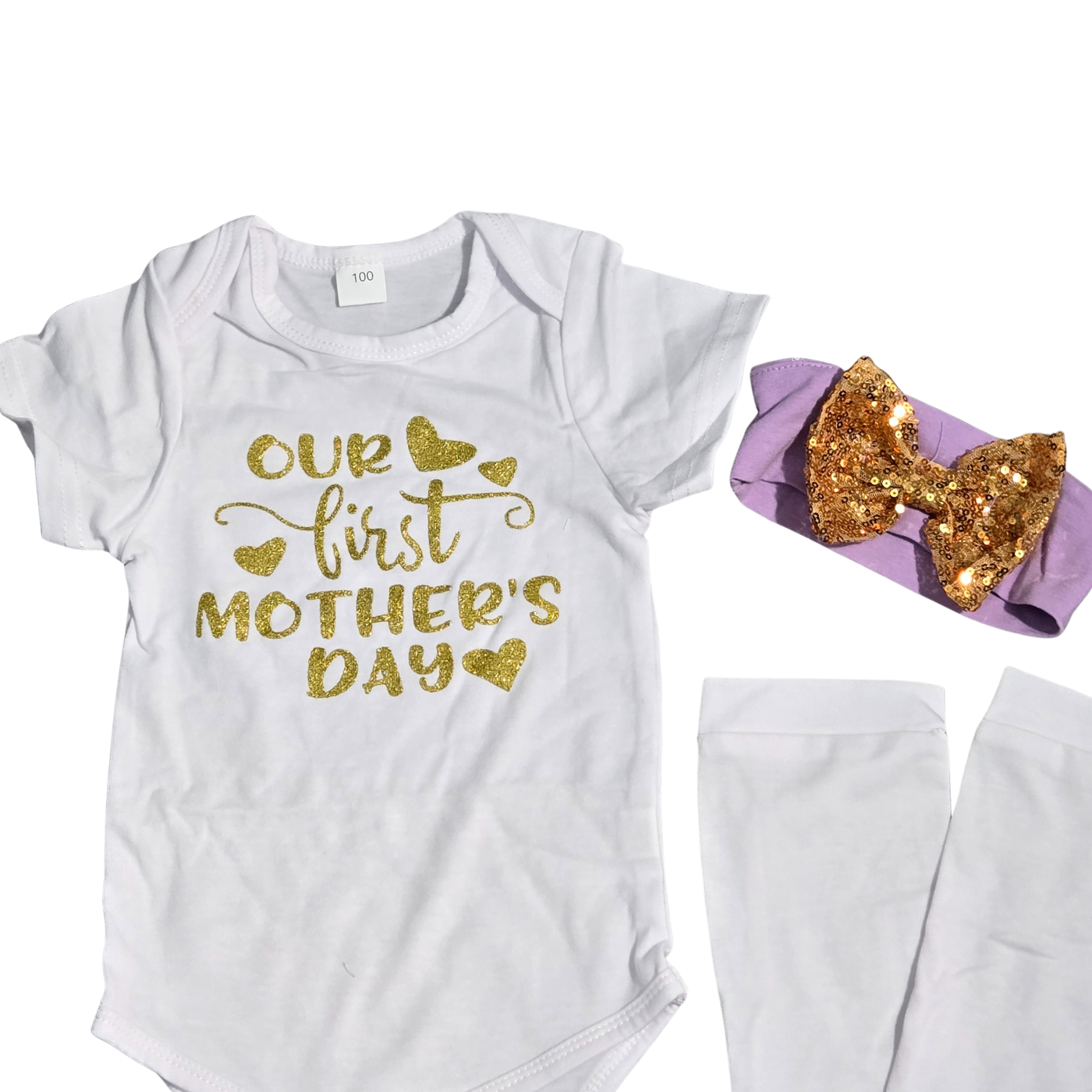 Capture the magic of a beautiful milestone with this complete and coordinated 5-piece Mother's Day outfit. This commemorative set features a white short-sleeve onesie adorned with a glittering gold "OUR first MOTHER'S DAY" graphic, perfectly paired with a vibrant purple tulle tutu skirt featuring a large gold sequin bow. The look is completed with matching white leg warmers and a soft purple headband, both accented with coordinating gold sequin bows for a dazzling, head-to-toe festive aesthetic. Crafted from soft and comfortable materials, this set is designed to keep your little one cozy while they celebrate their very first Mother's Day in style. 9-12 Months.
