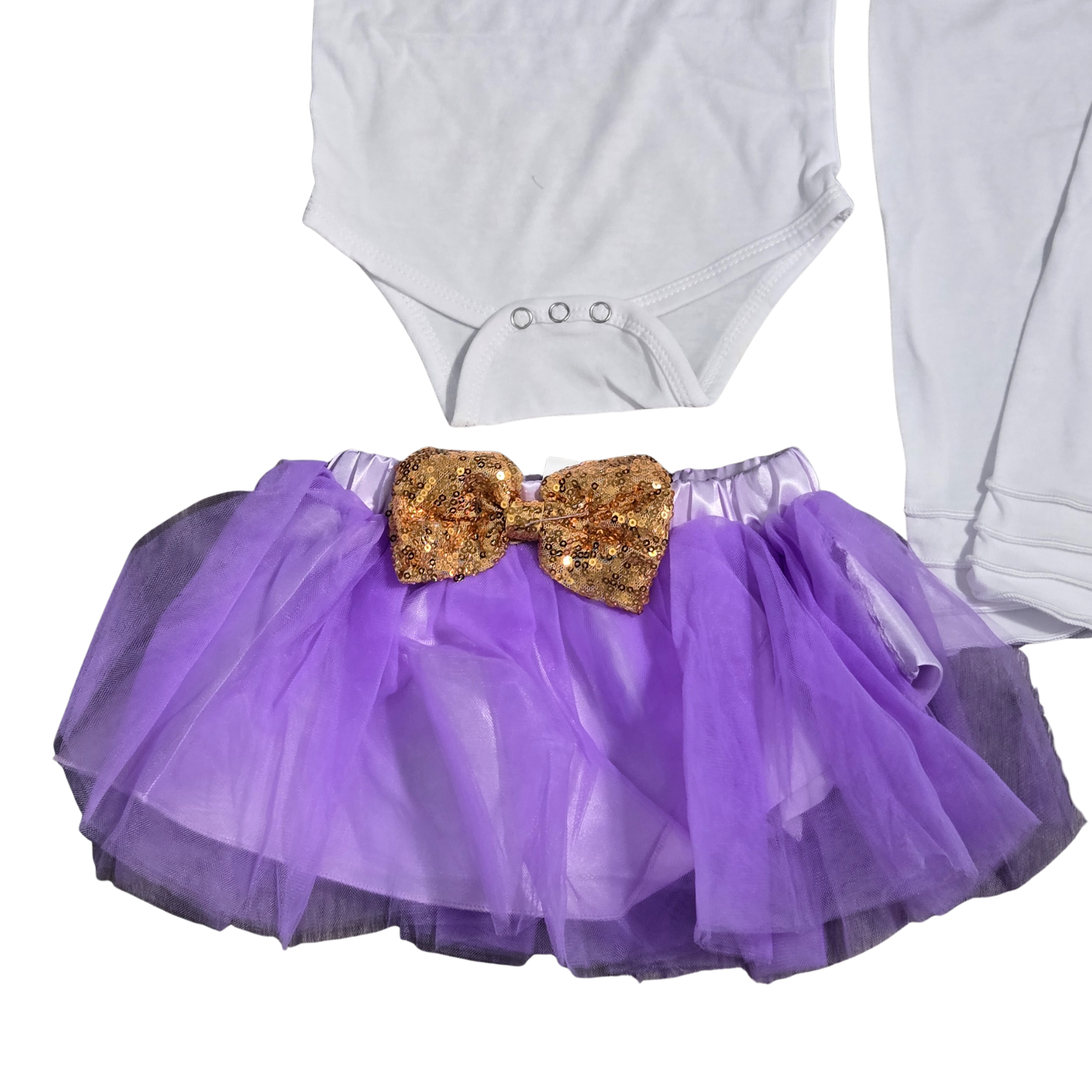 • Tutu Skirt: Layered purple tulle skirt with a comfortable satin-covered elastic waistband and a large gold sequin bow.