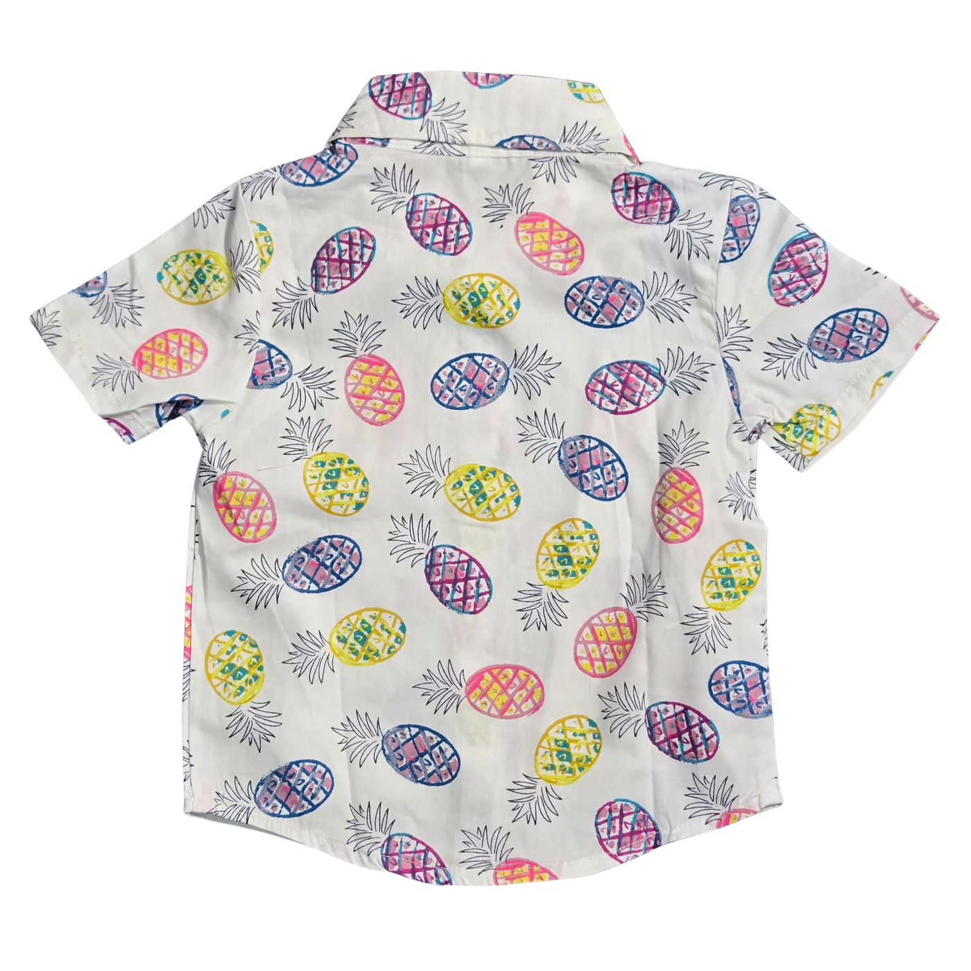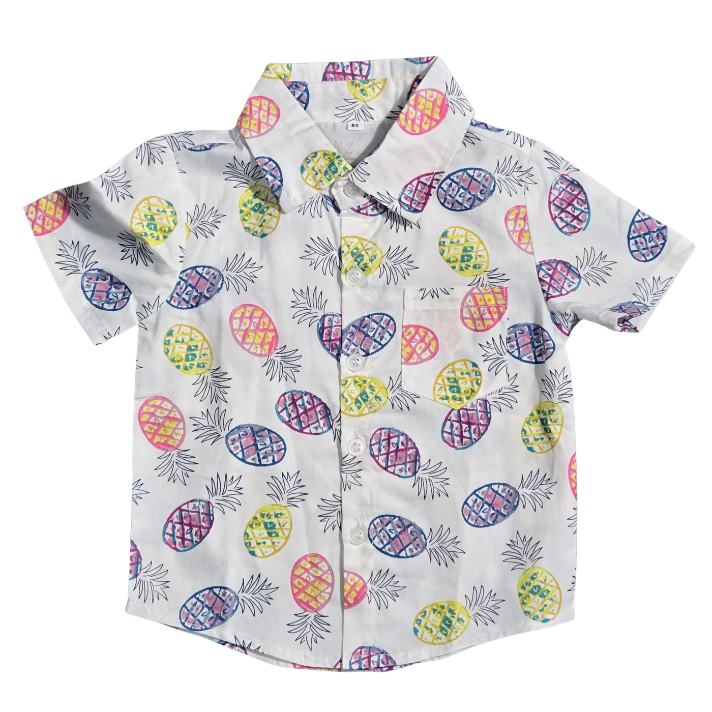 Get your little explorer ready for sunshine with this vibrant tropical button-up shirt. This crisp white shirt features a playful all-over multi-color pineapple print in shades of yellow, pink, and purple. Designed for both style and comfort, it boasts a classic pointed collar, a functional front chest pocket, and a full button-down front with clean white buttons for easy dressing. Crafted from a lightweight, breathable woven cotton fabric, this shirt is the perfect choice for summer parties, vacation photos, or any casual warm-weather outing. 9-12 Months.