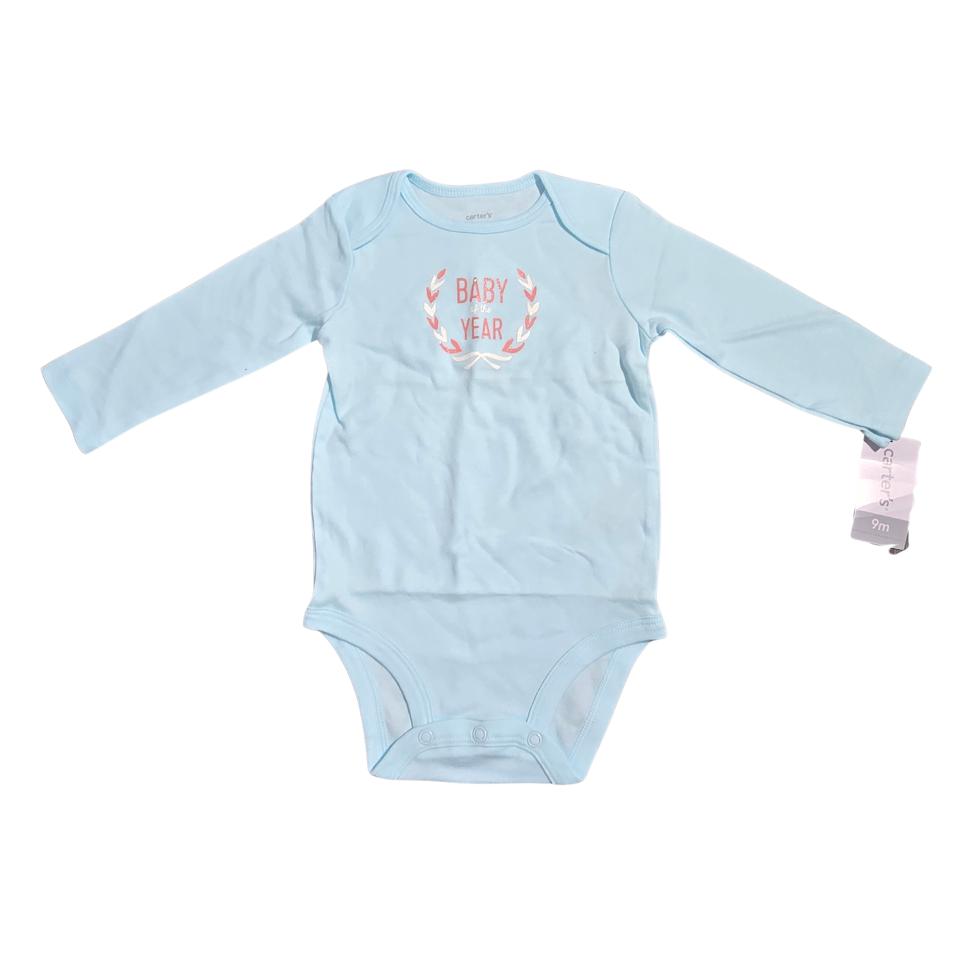 NWT | Carter's "Baby of the Year" Long Sleeve Onesie | Artistic Laurel Wreath Motif | Sky Blue | Size 9 Months
