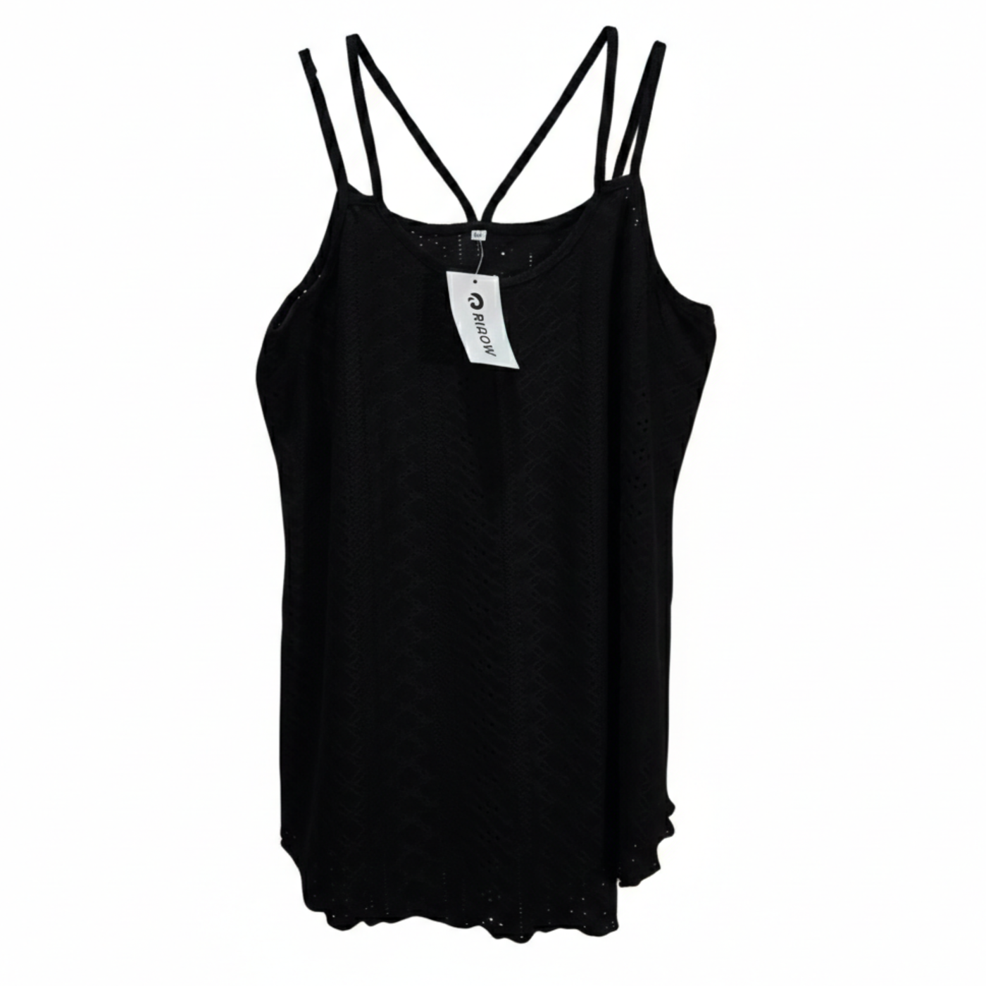 Elevate your daily rotation with this sophisticated black camisole from RIROW. Rendered in a timeless and versatile jet black, this modern essential features an all-over intricate eyelet lace pattern that provides a delicate, textured aesthetic. The contemporary silhouette is defined by a classic scoop neckline and an elegant open back featuring a multi-strap criss-cross design for a touch of edgy detail. Designed for maximum versatility, the top is finished with a charming scalloped hemline, making it the perfect choice for layering under a blazer or wearing as a standalone statement piece. Crafted from a premium soft-touch performance knit, this top provides exceptional breathability and comfortable stretch for all-day wear. Size Large.